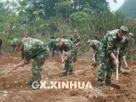 4月10日上午,武警百色市邊防支隊(duì)的“抗旱保苗突擊隊(duì)”為群眾開展春耕服務(wù)。(梁程 攝)