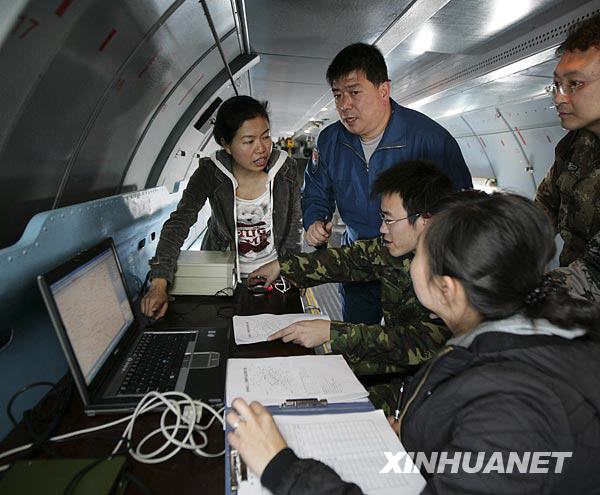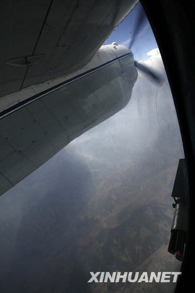 當日,成都軍區空軍駐黔人工增雨小分隊抓住有利天氣實施人工增雨。13時37分,接到指令后,一架加裝人工增雨設備的運-7運輸機,呼嘯著加速升空,飛赴增雨作業區域。機長、一級飛行員周正告訴記者,此前部隊已在貴州連續實施了多次人工增雨,今天的增雨作業將在畢節、遵義等幾個地區上空實施。14時,飛行接近云區,呈S形穿梭在云海之間,領航員介紹說:“S形飛行播撒效果最好,播撒藥劑面積大、范圍廣。”14時6分,在一片層積云上空,人工增雨專業人員按下點火器,碘化銀焰彈冒著紅色的火焰,生成催化劑灑向茫茫云海。在飛機上負責增雨的專業人員說,增雨作業后,24小時內將形成降雨。這次增雨空中云量條件不錯,飛機也最大限度進入了云層縱深,播撒時機也比較好,相信會有一個不錯的增雨效果。截至18時26分,飛機在安順、畢節、遵義等地上空實施兩個架次人工增雨。21時,從貴州省人工影響天氣領導小組辦公室傳來好消息,畢節地區普降小到中雨,降雨量為10毫米左右。新華社發(劉應華 攝)