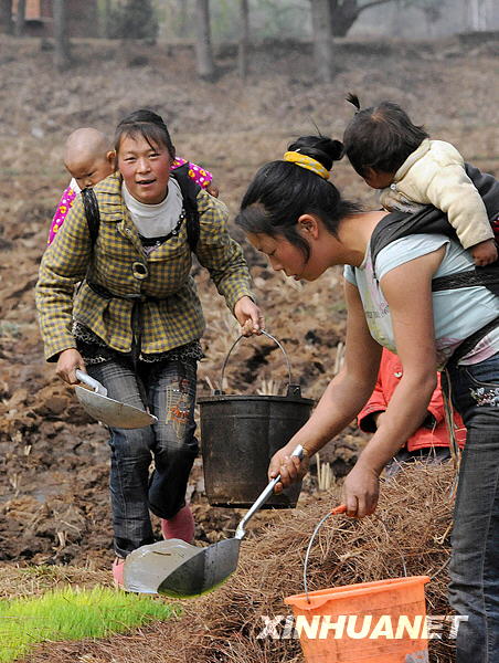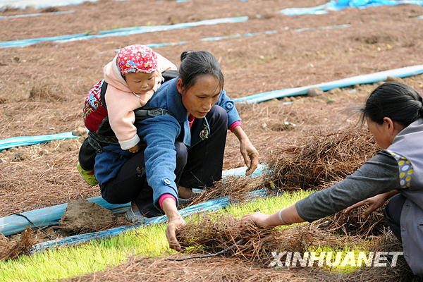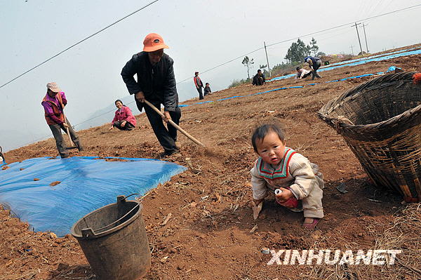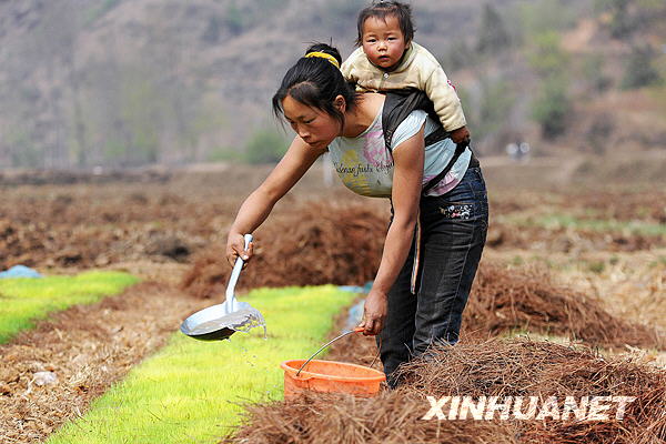 地處云南省宣威市的龍潭鎮,自2009年入秋以來遭遇了三季連旱。在抗旱的田間地頭,活躍著“抗旱媽媽”的身影。這些帶著孩子的婦女既要照看小孩,又要澆水、耪地、育苗,吃苦耐勞的精神感染了抗旱一線的每一個人。新華社記者何俊昌攝