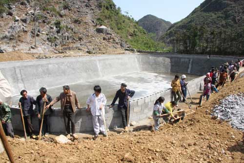 經過20多天的努力,4月8日,廣西百色市德保縣敬德鎮多浪村村民通過投工投勞,建成了一個大型蓄水池。圖為村民在修水池的配套設施。(龐革平、高九江攝影報道)