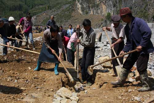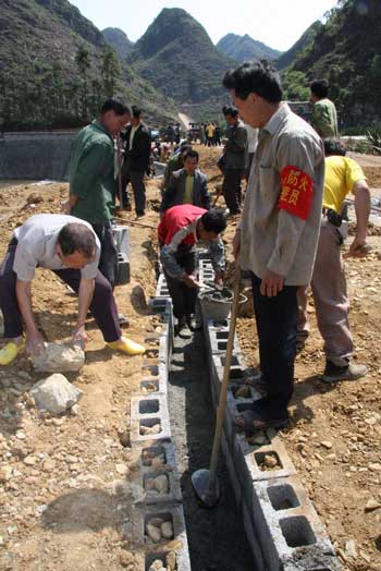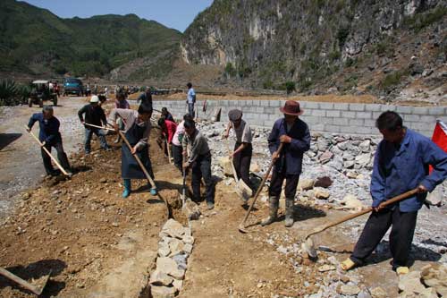 經過20多天的努力,4月8日,廣西百色市德保縣敬德鎮多浪村村民通過投工投勞,建成了一個大型蓄水池。圖為村民在修水溝,準備將水引進水池。(龐革平、高九江攝影報道)