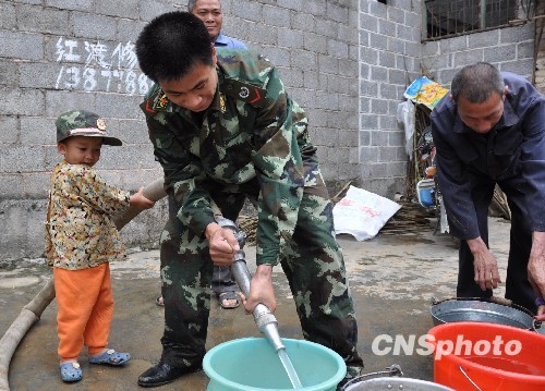 4月8日,廣西河池市都安瑤族自治縣澄江鄉(xiāng)下社屯,屯里的一名小孩高興地戴起消防官兵的帽子,與消防官兵一同為群眾送水。據(jù)國家防總辦公室統(tǒng)計,截至4月8日,廣西、云南、貴州、重慶、四川5省區(qū)市耕地受旱面積1.01億畝,2088萬人、1368萬頭大牲畜因旱飲水困難。中新社發(fā) 李勤政 攝