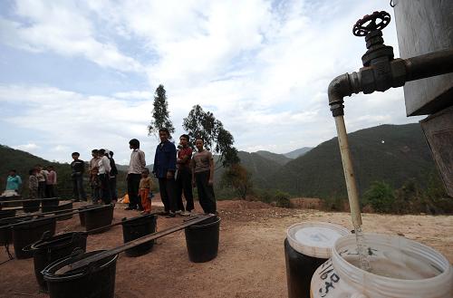 4月21日,云南省楚雄市東華鎮達苴村的彝族群眾在送水車前排隊取水。新華社記者 藺以光 攝