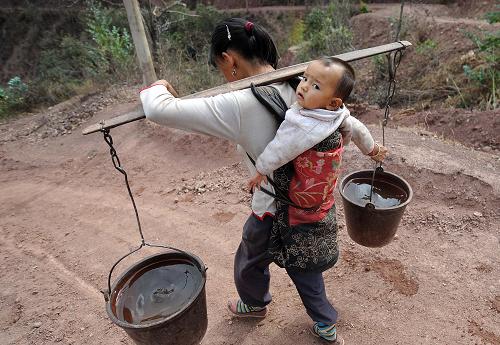 4月21日,在云南省楚雄市東華鎮達苴村,一位背著孩子的彝族婦女把送水車送來的水挑回家。新華社記者 藺以光 攝
