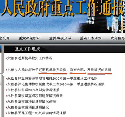 打開麗江市、縣政務網,記者發現永勝縣六德鄉政府一份看似不起眼的“通報”,該通報也是目前記者在麗江“網絡問政”過程中發現的麗江市鄉級政府相關抗旱救災款物流向通過政務網向社會公開唯一鄉政府。