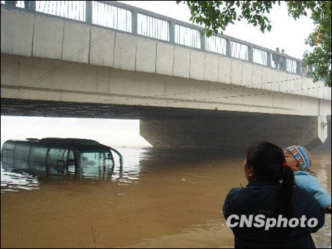 4月20日,廣西桂林市虞山橋下一輛旅游中巴車被洪水淹沒(圖片來源:中新網(wǎng))