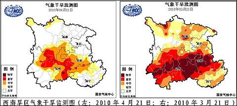 另外,4月21日農業干旱綜合監測結果表明,云南中北部和東部、貴州西南部、四川南部、廣西西北部存在中至重度干旱。與3月21日監測結果比較,貴州西南部、云南東南部、廣西西北部農業干旱得到緩和,云南西部和南部偏西地區、廣西中東部農業干旱得到緩解。