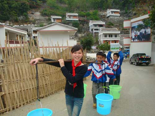 “我們牢記吳邦國爺爺?shù)膰谕校伺W(xué)習(xí)外,還開展‘節(jié)約用水從我做起’、‘抗旱自救有我責(zé)’等課外活動。”挑著小水桶走在前頭的小姑娘自豪地告訴記者。她叫張玉玲,今年12歲,是隴窮小學(xué)六年級學(xué)生、少先隊(duì)中隊(duì)長,這支少年抗旱送水隊(duì)便是她發(fā)起成立的。
