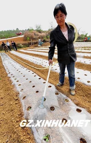 2010年4月12日,在貴陽市南明區(qū)永樂鄉(xiāng)永樂村,村民朱熙成家正在用小水窖里的水澆蘿卜秧苗。新華社記者 楊楹 攝