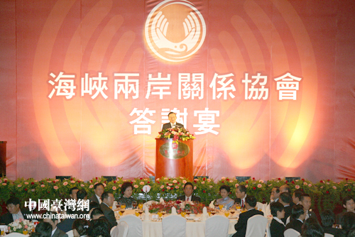 中國臺灣網11月6日臺北消息 海峽兩岸關系協會6日晚在臺北市圓山飯店舉行答謝晚宴,宴請海基會董事長江丙坤及海基會有關人士,并慶祝兩會成功簽署四項協議。