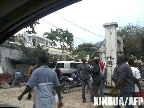 1月12日,在海地首都太子港,人們在地震發生后站在建筑物外。據中國國家地震臺網測定,北京時間1月13日5時53分,在海地地區(北緯18.5度,西經72.5度)發生7.0級地震,震源深度約10公里。新華社/法新