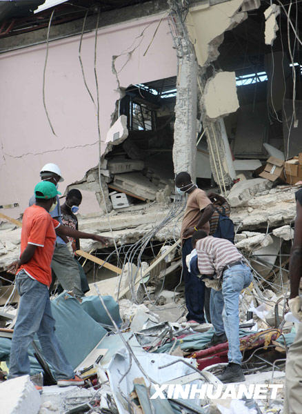 1月16日,在海地首都太子港市區(qū)內(nèi),幾名市民準(zhǔn)備進(jìn)入自家倒塌的房屋。新華社記者 袁滿 攝