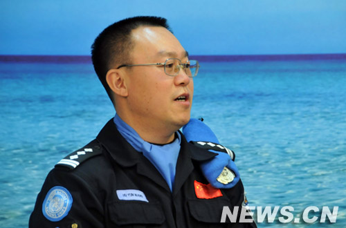 1月18日下午,中國第四支赴海地維和警察防暴隊政委陳定武;中國第五支赴海地維和警察防暴隊政委、即將再赴海地的胡運旺將做客新華網,講述遇難的好戰友和中國維和。圖為胡運旺在訪談中。為新華網 李非攝