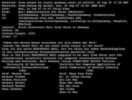 1987年9月14日晚上,北京計算機應用技術研究所里,十幾個人圍在一臺西門子7760大型計算機旁,他們的任務是發送一封電子郵件,內容以英德兩種文字書寫,中文譯為“跨越長城,我們可以到達世界的任何一個角落”。