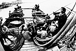 1982年, 福州萬門程控電話安裝現場。圖為郵電工人在水上施工布纜。