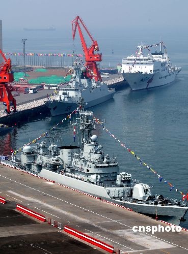 4月22日,停靠在青島解放軍海軍碼頭參加慶祝中國人民解放軍海軍成立60周年多國海軍活動的各國艦艇,各國海軍官兵相互登艦參觀,同時各國艦艇對青島市民開放,讓眾多各界人士在參觀中大開眼見。圖為中國海軍軍艦陣容齊整等待閱兵。