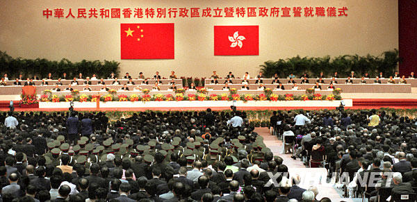 1997年7月1日0時0分0秒,中國政府恢復對香港行使主權。這是當日凌晨,中華人民共和國香港特別行政區成立暨特區政府宣誓就職儀式在香港會議展覽中心新翼七樓隆重舉行。新華社發