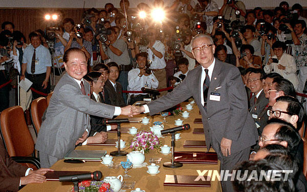 1993年4月,海峽兩岸兩個民間團體的領導人汪道涵和辜振甫在新加坡會晤。這是1993年4月27日,海峽兩岸關系協會會長汪道涵(左)與海峽兩岸交流基金會董事長辜振甫首次會談前握手。新華社發