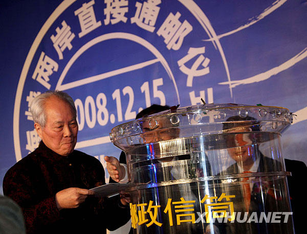 2008年12月15日,出生在臺灣的鄭堅老先生在北京舉行的兩岸直接通郵儀式上投寄出寄往臺灣的家書。當日,眾望所歸的兩岸海運直航、空運直航以及直接通郵正式啟動,兩岸同胞魂牽夢縈的直接“三通”得以基本實現。新華社發