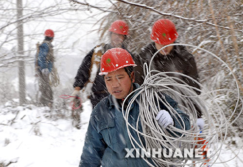 1月28日,宣城供電公司水東供電所員工冒著大雪搶修線路。 新華社發(李曉紅攝)