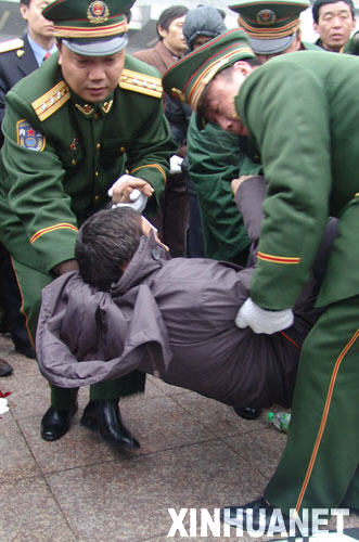 1月30日,一名老人在南昌火車站廣場因路面結冰不慎摔倒,正在火車站執勤的武警江西總隊一支隊官兵及時對老人進行應急搶救。