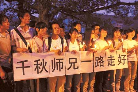 5月16日晚,在地震中為保護(hù)學(xué)生犧牲的譚千秋老師的骨灰在其妻子張關(guān)蓉和其他家人的護(hù)送下抵達(dá)長沙,并將送回他老家祁東縣安葬。在黃花機(jī)場(chǎng),100多輛出租車自發(fā)為他送行。湖南大學(xué)約2萬名學(xué)生手持蠟燭迎接他回到母校。