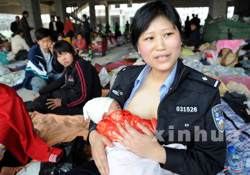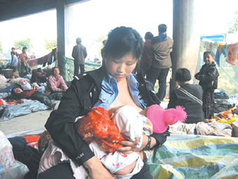 5月16日,四川江油縣公安局女民警蔣小娟在地震災民庇護所為一名地震災區孤兒喂奶。蔣小娟義務為一些急需哺乳的地震災區孤兒喂奶,卻“狠心”把自己才6個月大、同樣需要母乳喂養的孩子交給父母照料。 |