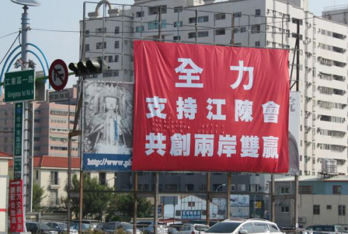 陳云林下榻的飯店前方路口,看到支持江陳會的看板。