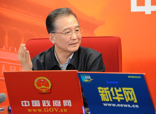 2月28日15時,中共中央政治局常委、國務(wù)院總理溫家寶與網(wǎng)友在線交流并接受中國政府網(wǎng)、新華網(wǎng)聯(lián)合專訪。圖為溫家寶回答網(wǎng)友問題。 陳競超 攝