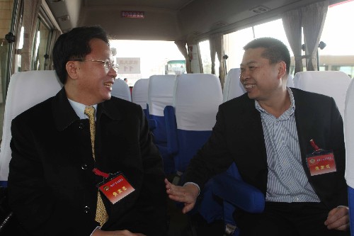 3月1日,兩位來自廣東省的全國政協委員、華南農業大學教授吳鴻(右)和中山大學教授劉昕在前往駐地的車上愉快交談。 當日,廣東省出席全國政協十一屆二次會議的全國政協委員抵達北京。 新華社記者 劉衛兵 攝