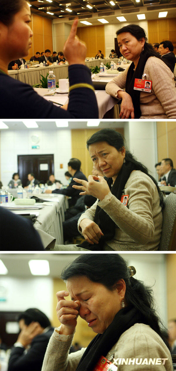 3月7日,在政協社會福利和社會保障界小組討論會上,高曉笛委員通過翻譯羅紅的手語翻譯,了解其他委員的發言情況(上圖、中圖)。當“聽到”委員們熱心支持殘疾人社會保障方面的發言后,她禁不住流下熱淚(下圖)。