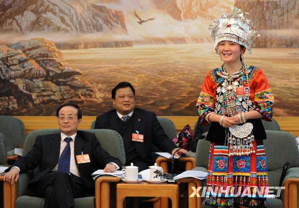 3月6日,出席十一屆全國人大二次會議的重慶代表團審議政府工作報告。全國人大代表、苗族姑娘李小燕在席間唱起山歌,表達喜悅心情。新華社記者 劉建生 攝
