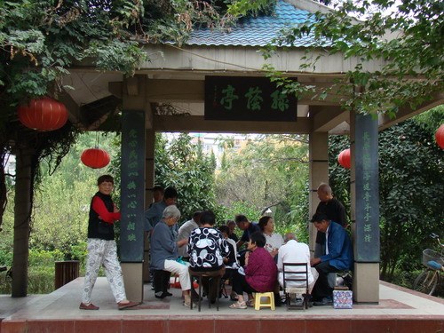 百步亭社區綠蔭亭上的對聯:長亭短亭亭連亭亭亭深情,黨心民心心換心心心相映