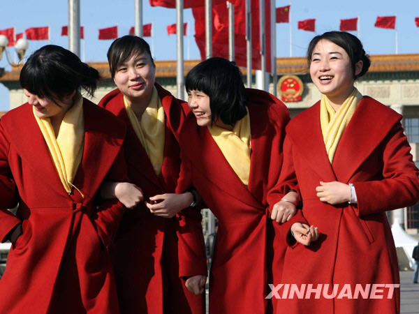 3月5日,為兩會服務的工作人員在北京人民大會堂前愉快交談。