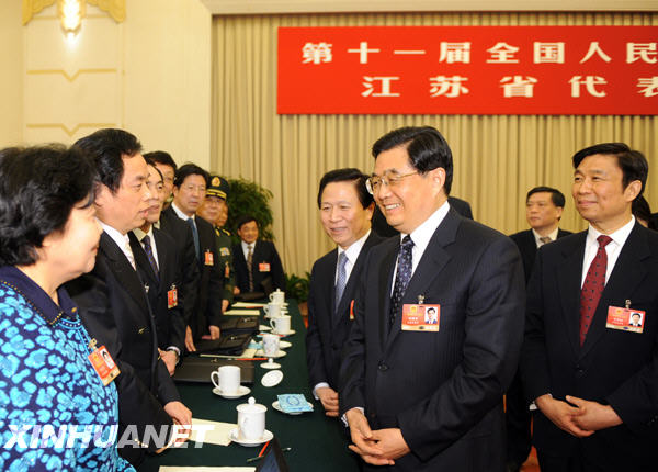 3月5日,中共中央總書記、國家主席、中央軍委主席胡錦濤參加十一屆全國人大二次會議江蘇代表團的審議。這是胡錦濤同代表們親切交談。新華社記者樊如鈞攝