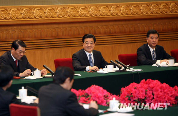 3月7日,中共中央總書記、國家主席、中央軍委主席胡錦濤參加十一屆全國人大二次會議廣東代表團審議。這是胡錦濤同代表們共商應(yīng)對國際金融危機沖擊、推動經(jīng)濟發(fā)展、促進社會和諧穩(wěn)定大計。新華社記者蘭紅光攝