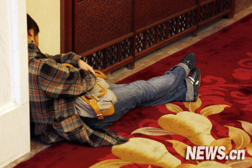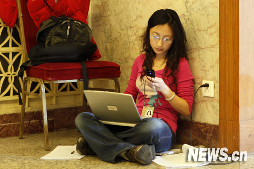 3月5日,一名記者席地而坐現場發稿。當日,十一屆全國人大二次會議在人民大會堂開幕。新華網 楊理光 攝