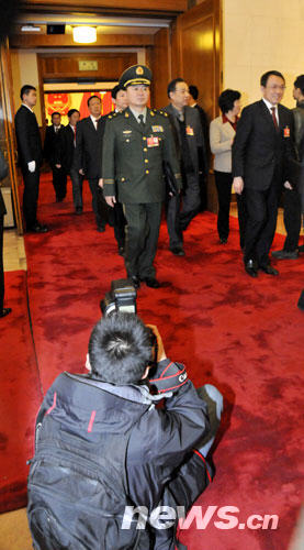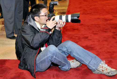 3月5日,一名攝影記者席地而坐拍照。當日,十一屆全國人大二次會議在人民大會堂開幕。 陳濤 攝