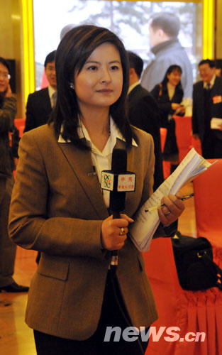 3月5日,中央電視臺記者張泉靈在進行采訪。當日,十一屆全國人大二次會議在人民大會堂開幕。 陳濤 攝