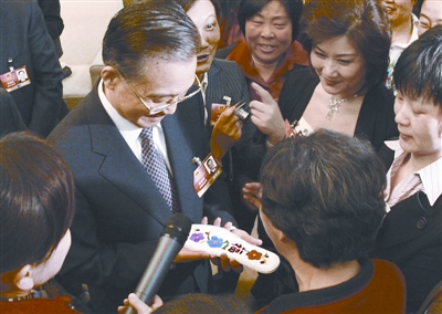 湖北代表將89歲老太所繡鞋墊贈送溫家寶