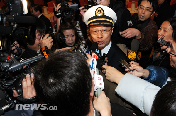 3月10日,十一屆全國(guó)人民代表大會(huì)第二次會(huì)議在人民大會(huì)堂舉行第三次全體會(huì)議,聽取最高人民法院院長(zhǎng)王勝俊作最高人民法院工作報(bào)告;聽取最高人民檢察院檢察長(zhǎng)曹建明作最高人民檢察院工作報(bào)告。圖為一位解放軍代表在當(dāng)天會(huì)議休會(huì)離開時(shí)被媒體“包圍”采訪。文濤 攝