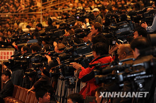 3月5日,第十一屆全國人民代表大會第二次會議在北京人民大會堂開幕。這是記者在會場采訪。新華社記者 黃敬文攝