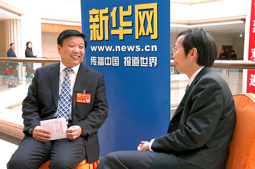 2008年3月7日下午3時,第十一屆全國人民代表大會第一次會議山東省代表團全體會議在職工之家舉行。圖為全國人大代表、山東省省長姜大明在會場外接受新華網記者采訪。新華網 郭毅 攝(資料圖片)