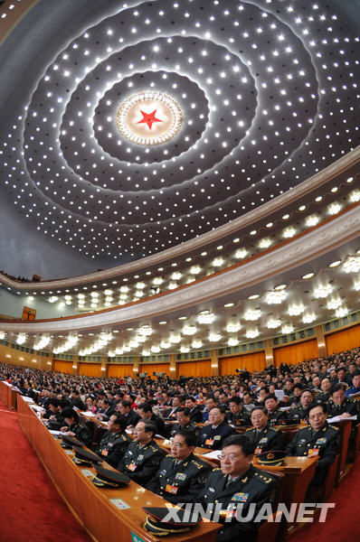 3月8日,十一屆全國人大三次會議在北京人民大會堂舉行第二次全體會議,聽取全國人大常委會副委員長王兆國關于中華人民共和國全國人民代表大會和地方各級人民代表大會選舉法修正案草案的說明。這是大會會場。新華社記者饒愛民攝