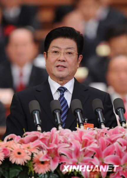 3月8日,十一屆全國人大三次會議在北京人民大會堂舉行第二次全體會議。受全國人大常委會委托,全國人大常委會副委員長王兆國向大會作關于選舉法修正案草案的說明。新華社記者饒愛民攝