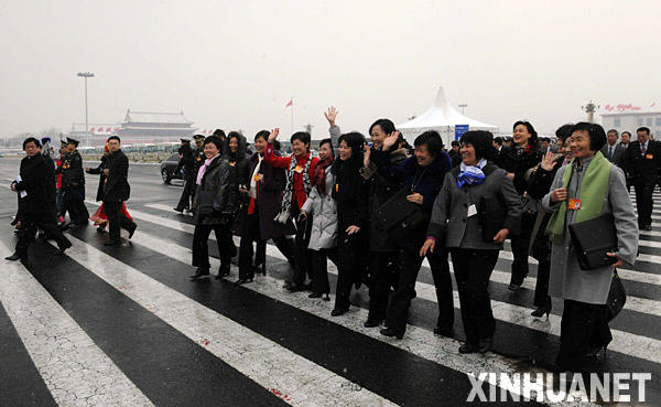 3月8日,十一屆全國(guó)人大三次會(huì)議在北京人民大會(huì)堂舉行第二次全體會(huì)議。這是全國(guó)人大代表冒雪抵達(dá)天安門廣場(chǎng)。新華社記者陳樹根攝