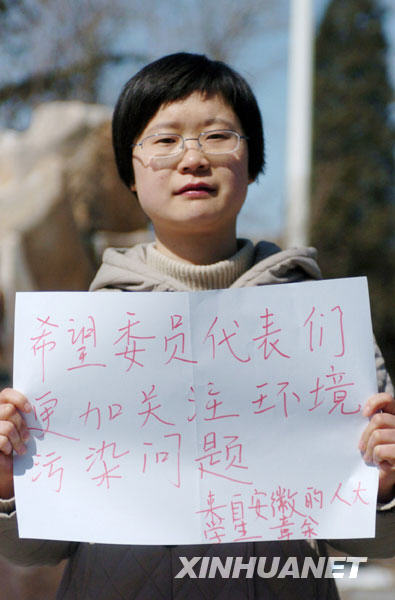 3月9日,中國人民大學學生章余說,希望兩會的代表、委員們能夠更多關注環境污染問題。新華社記者 郭晨 攝