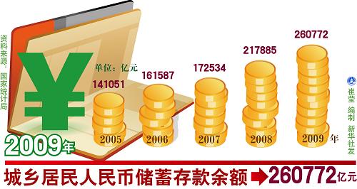 圖表:2009年城鄉(xiāng)居民人民幣儲蓄存款余額260772億元 新華社發(fā)