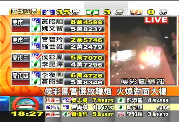 據(jù)臺(tái)灣東森新聞報(bào)道,可能是侯彩鳳的支持者太過(guò)熱情,放鞭炮放太多,不小心把鞭炮丟到競(jìng)選總部對(duì)面的屋頂,因而釀成火警。消防隊(duì)已經(jīng)趕到現(xiàn)場(chǎng)救火,所幸沒有人員傷亡。(周先) |