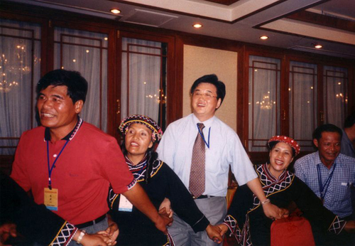 徐剛主任在瓊臺(tái)少數(shù)民族交流活動(dòng)中,與臺(tái)灣少數(shù)民族同胞一起載歌載舞。(資料照片)